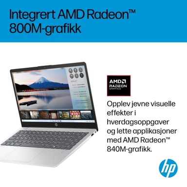 HP OmniBook 3 drives av en AMD Ryzen™ AI 5-prosessor, med seks kjerner og en maksimal turbofrekvens på 4,8 GHz. Dette oppsettet sikrer jevn og effektiv ytelse for en rekke applikasjoner, fra produktivitetsprogramvare til multimediaoppgaver. Den integrerte AMD Radeon™ 840M-grafikkarkitekturen støtter delt grafikk, noe som gjør den i stand til å håndtere daglige visuelle oppgaver med letthet.