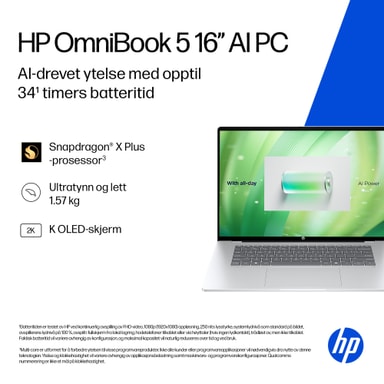 HP OmniBook 5 16" AI-PC-en, med den nye Snapdragon® X Plus-prosessoren², leverer AI-drevet ytelse og en utrolig batteritid på opptil 34 timer¹ – slik at du kan bruke den hele dagen uten å ta med laderen. HP AI Companion³ fungerer som din personlige assistent direkte på enheten, og effektiviserer arbeidsflyten – helt uten abonnement.