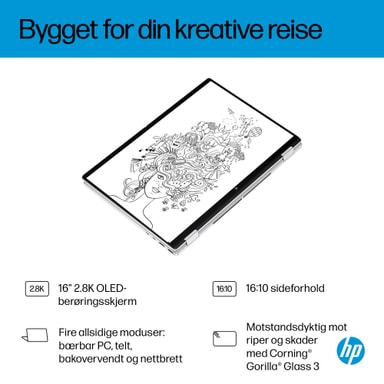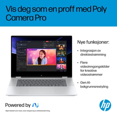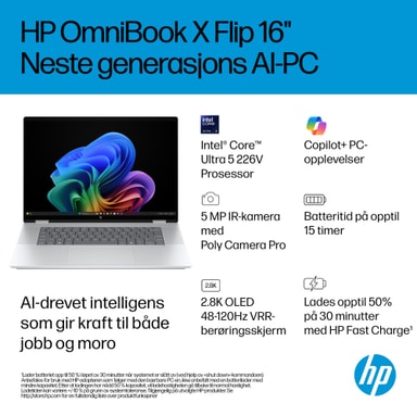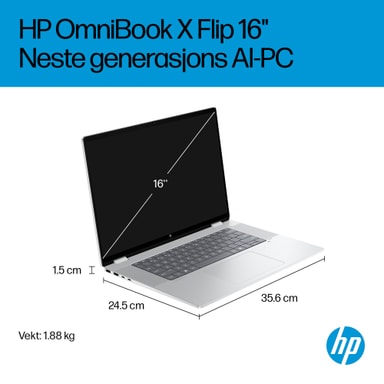 Fremtiden er her med HP OmniBook X Flip 16" Next Gen AI-PC. Enten du vil underholdes eller ferdigstille kreative prosjekter, har denne AI-drevne PC-en prosessorkraften og ytelsen som trengs for å få det til. Med en imponerende 16" 2.8K OLED-skjerm og muligheten til å bruke den flatt, brettet eller snudd, får du levende farger og høy kontrast uansett hvilken vinkel som passer humøret ditt. Laget i elegant, resirkulert metall¹ og designet med et bakbelyst tastatur med store tastelokker, er din fremtidige PC både stilren og funksjonell.