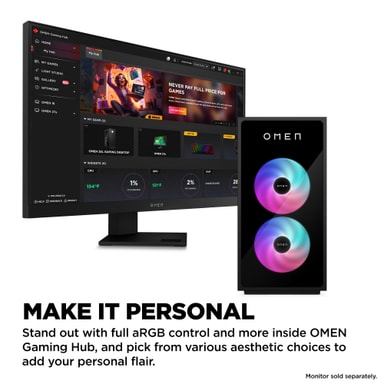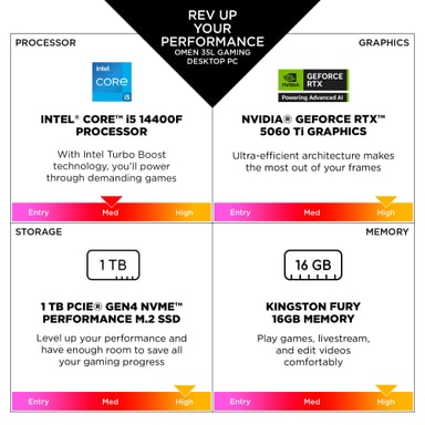 OMEN 35L gaming-PC drives av Intel® Core™ i5-14400F-prosessoren, som sikrer høy hastighet og responsivitet. 16 GB DDR5 RAM forbedrer multitasking, mens 1 TB SSD gir raske lastetider og effektiv datahåndtering.