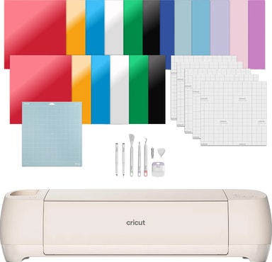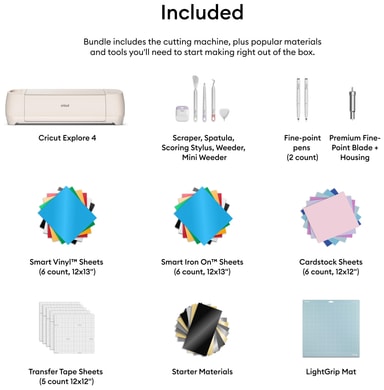 I tillegg til Cricut Explore 4 basispakken inkluderer denne pakken også ekstra materialer og verktøy slik at du kan begynne å lage håndverk med en gang!