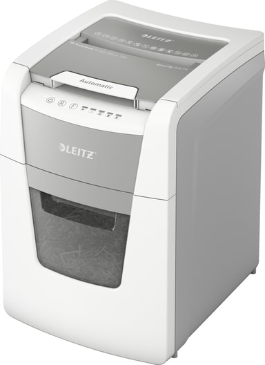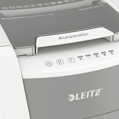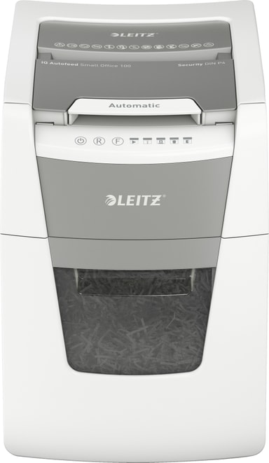 Leitz IQ AutoFeed SmallOffice 100 P4 makuleringsmaskin gjør krysskutt og kan makulere kredittkort og papir med binders eller stifter. Den automatiske materen tar opptil 100 ark om gangen, og ved manuell mating kan den håndtere opptil 8 ark.Les mer om produktet