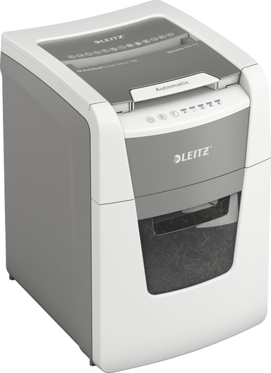 Leitz IQ AutoFeed SmallOffice 100 P4 makuleringsmaskin er så intelligent at den arbeider stille på egen hånd. Den kutter i kryss og mater seg automatisk med opptil 100 ark på en gang. Den har touchfølsomme knapper for intuitiv bruk, og manuelt kan du makulere 8 ark om gangen. Alt som går gjennom makulatoren ender opp i en 34 liters beholder som krysskuttede biter på 4 x 30 mm, noe som tilsvarer P-4 DIN-sikkerhetsnivå. Med denne makuleringsmaskinen slipper du å manuelt mate papir eller fjerne stifter og binderser først. Takket være den automatiske materen gjøres den jobben for deg.