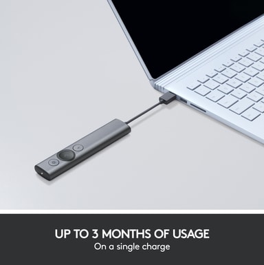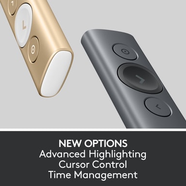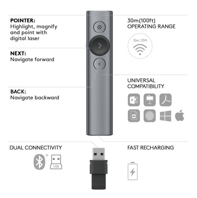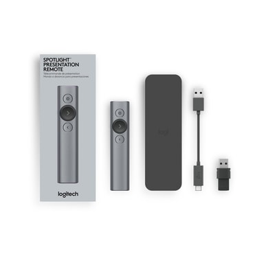 Logitech Spotlight presentasjonsfjernkontroll er spesialdesignet for å heve og gjøre presentasjonene dine mer strømformede. Ved hjelp av Logitech Spotlight presentasjons-app kan du zoome og forstørre direkte på skjermen med pikselperfekt nøyaktighet kun ved ett tastetrykk. Med timeren unngår du rot ved slideskift eller at du snakker for lenge. Du kan skreddersy timingen av sliden til å passe perfekt til presentasjonen og motta en lett vibrasjon fra fjernkontrollen når tiden er brukt opp. Fjernkontrollen støtter også programmerbare bevegelseskontroller for de fleste slideshow og apper, slik at du enkelt kan gå til neste slide, skrolle eller panorere med en håndbevegelse. Fjernkontrollen støtter plug&play og nesten alle plattformer og operativsystemer og kan lades via USB med og vare i 3 måneder på én lading.