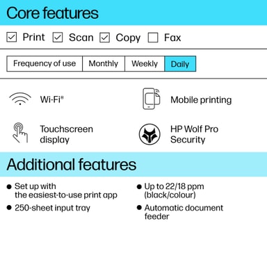- Kapasitet for A4-papirinnskuffer: 250 ark