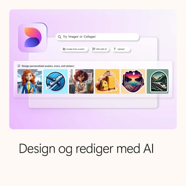 Gi liv til ideene dine med kraftige funksjoner1 og verktøy drevet av kunstig intelligens i Microsoft 365. Lag unike design og rediger bildene dine i Designer. Lag videoer som en proff i Clipchamp. Overvinn skrivesperren og uttrykk deg trygt med Copilot1 ved din side i Word.