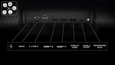 Fullstendige tilkoblingsmuligheter gir stor kompatibilitet med andre enheter: 2x HDMI 2.1, 1x Display Port 1.4, 3x USB 3.0, 1x fullfunksjons Type-C, 1x hodetelefonkontakt og en praktisk uttrekkbar hodesettholder.