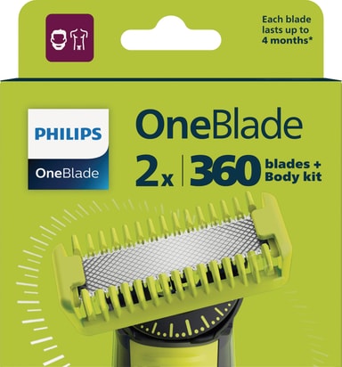 Philips OneBlade barberbladsett QP624/50 er et flott tillegg til din pleierutine. Settet inneholder to barberblader i rustfritt stål, en kroppskam og en hudbeskytter som beskytter huden din mot kutt. De vanntette, tosidige bladene er utformet for å passe til alle OneBlade-håndtak.