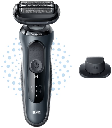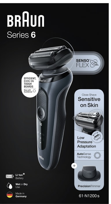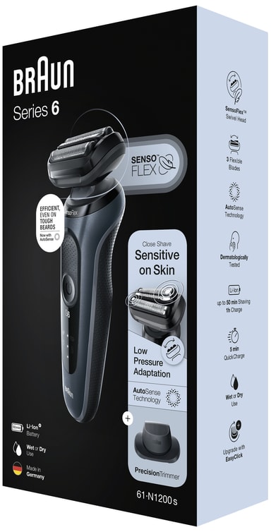 Med Braun Series 6 barbermaskin 61-N1200s vil du få en tett barbering uten å måtte bekymre deg for irritert hud. Barbermaskinen kommer med SensoFlex-hode og SensoFoil-blader som leverer optimal tetthet og komfort under barberingen, mens AutoSense-teknologien leser av hårtettheten og justerer effekten for en perfekt barbering. Den er ellers kompatibel med EasyClick-systemet som lar deg oppgradere barbermaskinen med matchende tilbehør.