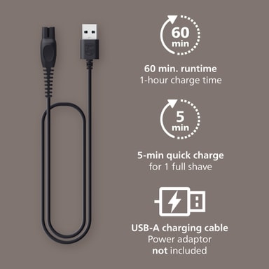 Den gir opptil 60 minutters bruk på en 60-minutters lading, med en 5-minutters hurtiglading som gir nok strøm til én full barbering.