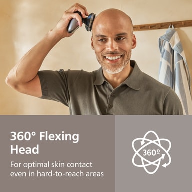 Det 360° fleksible hodet beveger seg i alle retninger for å følge konturene på hodet ditt, noe som sikrer jevn kontakt og en jevn barbering.