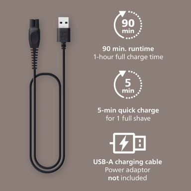 Den gir opptil 90 minutters bruk på en 60-minutters lading, med en 5-minutters hurtiglading som gir nok strøm til én full barbering.