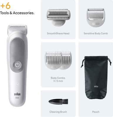 Braun Series 5 kroppstrimmer B5550dekker alt det grunnleggende. 100-minutters brukstid og oppladningstid på 90 minutter gjør den fin til både reiser og hjemmebruk. De ultraskarpe bladene sikrer rask håndtering og presisjon foran speilet. Den er enkel å rengjøre og kommer med flere tilbehør til alle formål.