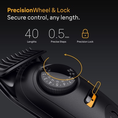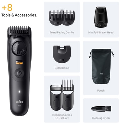 kombinerer et vanntett design og 40 ulike lengder med ultraskarpe blader, 120-minutters brukstid og et bredt utvalg av tilbehør. Bruk kammer, en detaljtrimmer og et Mini Foil-barberhode til å stelle skjegget slik du ønsker.