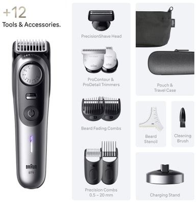 Braun Series 9 skjeggtrimmer består av fire kammer, tre tilbehør, og en skjegg-sjablong for presis frisering. En ladedokk, bag, og reisedeksel gjør det lett å ta med seg, mens rengjøringsbørsten sikrer enkelt vedlikehold.