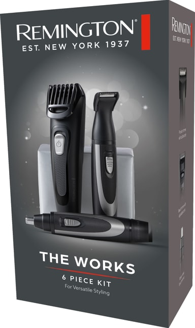 Remington The Works skjeggtrimmersett MB905 lar deg frisere skjeggveksten din daglig på presist vis. Det inkluderer seks vedlegg for trimming av nese- og ørehår,slik at du kan enkelt trimme det du skulle ønske.Trimmeren har en brukstid på 45 minutter når det er fulladet, og kommer med en skjeggstubb-kam som tilbyrni lengdeinnstillinger fra 2 mm til 18 mm.