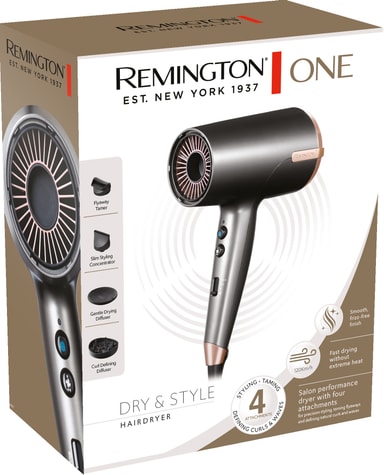 Remington ONE Dry and Style Hairdryer leveres med fire ulike stylingtilbehør: en Slim Styling Concentrator og en Flyaway Tamer for retting av håret, samt en Gentle Drying Diffuser og en Curl Defining Diffuser for å fremheve naturlige krøller og bølger. Hårføneren har 8 forskjellige kombinasjoner av varme og hastighet, i tillegg til en Thermacare-sensor som beskytter håret mot ekstrem varme. Dette gjør at du kan tørke og style håret raskt og effektivt, slik at det alltid er klart for dagen på et øyeblikk.