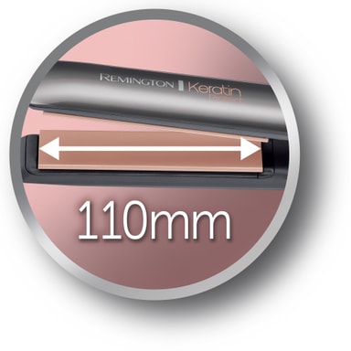 Keramisk belegg: De 110 mm lange platene med keratin og mandeloljebehandlet keramisk belegg sørger for jevn varmefordeling og frizz-fritt resultat.