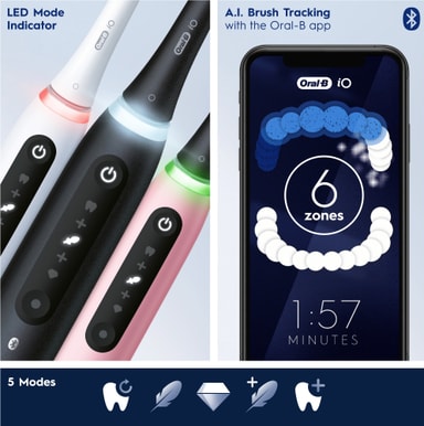 Revolusjonerende iO-teknologi kombinerer det unike runde børstehodet med mikrovibrasjoner som gir en komfortabel pusseopplevelse og følelsen av rene tenner og et sunnere tannkjøtt, merkbart etter kun én uke med bruk (sammenlignet med en manuell tannbørste).