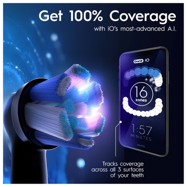 Revolusjonerende iO-teknologi kombinerer det unike runde børstehodet med mikrovibrasjoner som gir en komfortabel pusseopplevelse og følelsen av rene tenner og et sunnere tannkjøtt, merkbart etter kun én uke med bruk (sammenlignet med en manuell tannbørste)