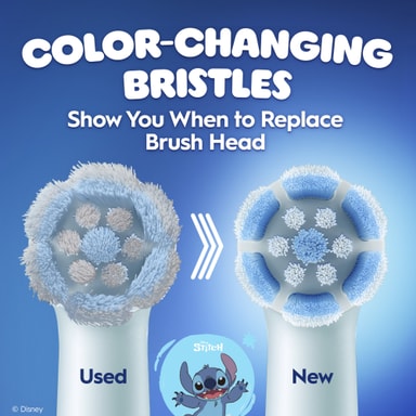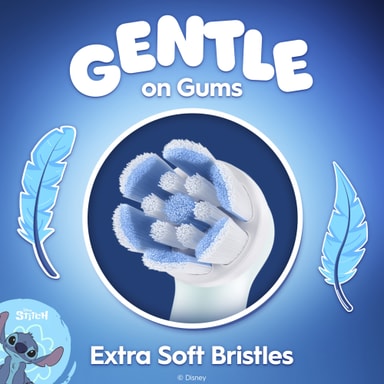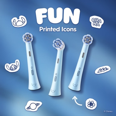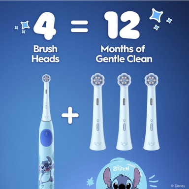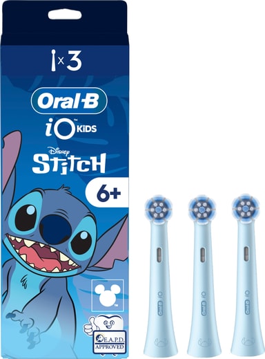 Oral-B iO Kids Stitch tannbørstehoder 930604 inkluderer tre børstehoder laget for barn fra 6 år og oppover. Det lille runde hodet og de ekstra myke børstene rengjør godt samtidig som de er skånsomme mot tannkjøtt og løse tenner. Børstene falmer fra blått til hvitt når det er tid for utskifting, og tannleger anbefaler å bytte hoder hver tredje måned.