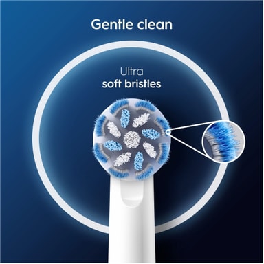 Oral-B Pro Sensitive Clean & Care tannbørstehode018807 gir skånsom, men effektiv rengjøring med myke børstehår som er ideelle for sensitive tenner og tannkjøtt. De X-formede børstehårene når dypere for å fjerne mer plakk enn en manuell tannbørste, mens en fargeindikator viser når det er på tide å bytte. Kompatibel med de fleste oppladbare Oral-B tannbørster, unntatt Pulsonic og iO-modeller.