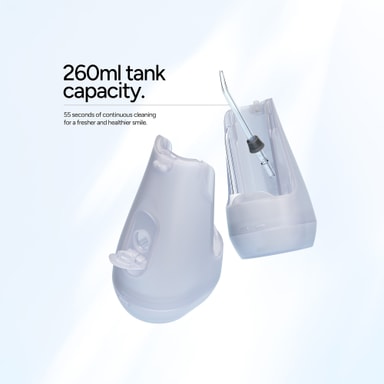 Vannflosseren har en 260 ml vanntank og et buet, riflet design med en slank dyse for presis rengjøring. Praktisk plasserte trykknivåer og av/på-knapper på fremsiden sikrer enkel kontroll.