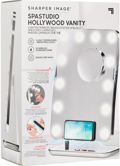 Sharper Image speil P001310 forandrer alt. Du kan gjøre deg klar under justerbart lys, virkelig fokusere på detaljer med det avtakbare forstørrelsesspeilet, bruke tørkeviftene til å tørke neglelakken raskere, og du kan lade telefonen trådløst mens du gjør alt dette. Du kommer til å se fantastisk ut på null komma niks.