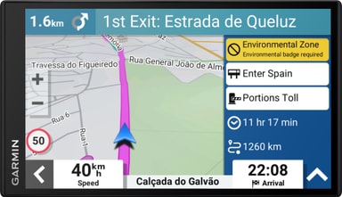 Hold deg oppdatert om trafikken og kommende kurver, fartsendringer, jernbaneoverganger, fotobokser og skolesoner takket være det intuitive grensesnittet og detaljerte kart med støtte for 3D-bygninger og terreng. Takket være Garmin Voice Assist kan du enkelt be om veibeskrivelse uten å ta hendene av rattet, bare ved å si "OK, Garmin". GPS-en støtter talekommandoer på britisk engelsk, dansk, nederlandsk, indisk engelsk, europeisk fransk, tysk, italiensk og europeisk spansk.