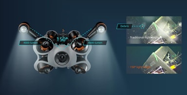 Chasing M2 Pro Max er ustyrt med 2x kraftige 4000 lumen LED lys. Med disse får du bedre belysning en med noen av Chasings tidligere standard ROVer. Et kjent problem med filming under vann er at det er partikler og luftbobler i vannet. Ved bruk av belysning kan disse bli opplyst og oppleves som støy/snø i skjermbildet. På Chasing M2 Pro Max er LED-lysene montert på armer som gir deg mulighet til å trekke lyskildene lenger bort fra linsen. Plassert i en 150 graders vinkel trukket vekk fra linsen gir dette et betydelig bedre resultat. Skal man operere på trange steder eller steder hvor det er fare for å hekte lysarmene fast er det mulig å trekke disse inn til kroppen. Dette er også praktisk ved transport/oppbevaring.