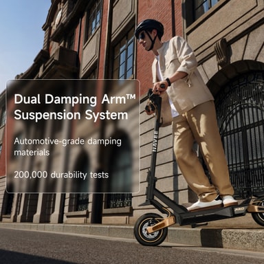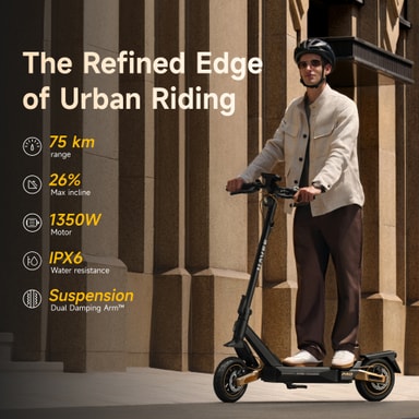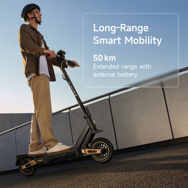 Denne sparkesykkelen tilbyr en betydelig maksimal rekkevidde på 75 km, spesielt optimalisert for langdistansependling. For langdistansekjørere har den et modulært system hvor et eksternt batteri kan plugges inn, noe som effektivt dobler den totale rekkevidden til imponerende 148 km.