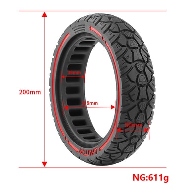 Punkteringsfrie dekk - trygge og vedlikeholdsfrie: Dette dekket gjør at du ikke trenger bekymre deg for flere punkteringer. Det solide dekket krever ingen slanger eller luft og du unngår punkteringer, reparasjoner og vedlikehold fullstendig. Det mønstrede dekket er laget av slitesterk gummi og har en overflate som gir utmerket grep og god sklibeskyttelse, selv i snø og regn. Elsparkesykkel-dekket er trykkbestandig, robust og støtdempende, noe som gir ekstra komfort.