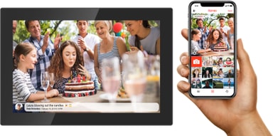 Den 10,1-tommers WiFi-rammen har en klar IPS-touchskjerm med 1280 x 800p-oppløsning. Eieren av fotorammen kan samhandle med de innkommende bildene, gi likes eller legge til kommentarer selv uten en sosial nettverkskonto.