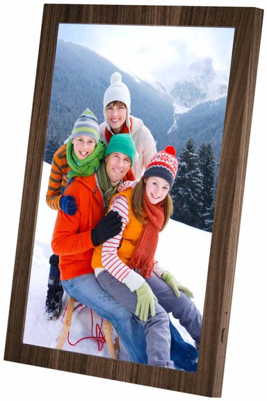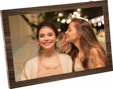 Den enkle, brune rammen med trefinish passer perfekt inn i de fleste innredninger, enten det er på nattbordet, på en hylle på kjøkkenet eller på veggen i stuen. Rammen kan monteres på veggen takket være et VESA 100-feste, og den har også et lite stativ på baksiden. I tillegg har Frameo en innebygd klokke og kalender samt en av/på-funksjon som gjør at du ikke blir forstyrret om natten. Hold minnene dine i nærheten.