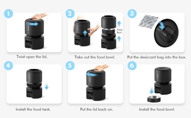 Den automatiske kattemateren har et enkelt påfyllsystem med skrulokket, som lar deg fylle kattemateren og lukke den, slik at katten din ikke får tilgang. Lokket har en tørkeagent-pose, som holder maten ferskere lenger. Den har også et trippelt anti-blokkeringssystem, som inkluderer en silikonrotor, en segmentert struktur og en infrarød sensor, som forhindrer kattemateren fra å porsjonere ut mat dersom noe sitter fast eller hvis skålen er full.