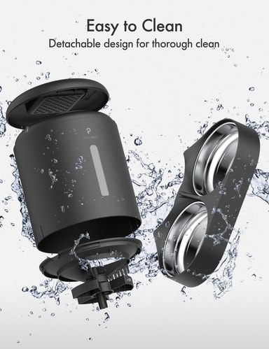Kattemateren er designet på en lettrengjørlig og avtagbar måte, som gjør det lett å skylle bort støv og rusk med vann. Den mottar strøm via en USB-C-ledning og har plass til tre D-alkaliske batterier, som sikrer at kattemateren forblir operasjonell selv om strømmen går.