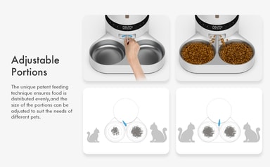 Takket være muligheten til å planlegge måltider frem i tid, slipper du å bekymre deg for om du har husket å mate katten i tide. Porsjonsstørrelsesfunksjoner forhindrer katten din fra å spise for mye eller for ofte. Måltidsplanen og porsjonsstørrelsen kan tilpasses på en enkel måte ved å bruke displayet og knappene.