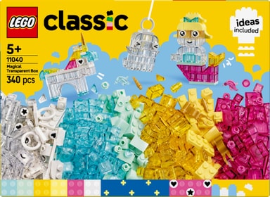 LEGO® Classic Magisk boks med gjennomsiktige klosser (11040) gir barn grenseløs, kreativ moro. Med 340 fargeglade klosser, hvorav mange er gjennomsiktige, samt diverse spesialelementer, stimulerer dette bygge- og utstillingssettet barns kreativitet med magiske modeller og fantasifull lek.