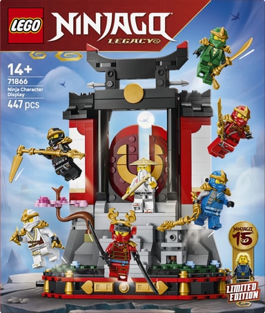 • UTSTILLINGSSOKKEL MED NINJA-LEKER – 15-årsjubileumssett med ninja-figurer (71866) er et byggesett for jenter, gutter og nostalgiske fans fra 14 år og markerer 15-årsjubileet for LEGO® NINJAGO® TV-serien