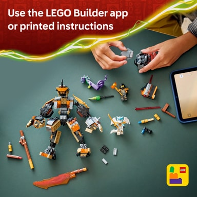 Roboten inneholder tre våpen: et sverd, en stav og en fjærbelastet blaster med to piler, og barn kan bytte ut våpnene med våpen fra settet Ninja-dragen Riyus kamp (71855) (selges separat). NINJAGO leken inkluderer også tre minifigurer: Cole med hammer, Zane i drageform med sverd og et Syremonster med stav, som kan brukes i spennende rollelek-kamper.