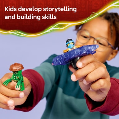 Dette tøffe, lille LEGO settet byr på masse lek og inkluderer to minifigurer: Nya med et sverd og Mutasjonsmonster-skurken som kan sitte oppi spinnerleken. Med disse NINJAGO figurene kan barn la det gode kjempe mot det onde i timevis med lek.