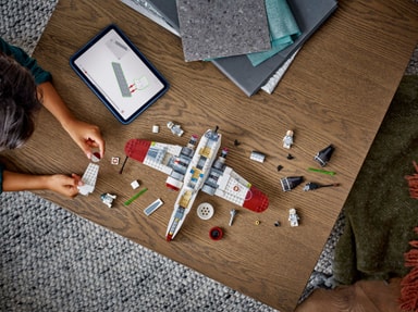 Gi barn en enda bedre kreativ opplevelse med LEGO Builder appen, hvor de kan zoome og rotere en digital 3D-versjon av Star Wars stjernejageren de bygger.