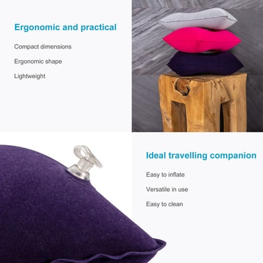 DESIGN: Denne puten er oppblåsbar og derfor lett å transportere. Den er spesielt praktisk på reise, på stranden eller bare hjemme. Et must i enhver husholdning!