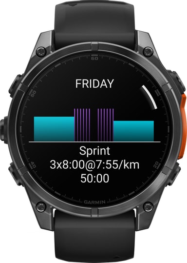 Få personlige treningsplaner, inkludert adaptive 5K-, 10K- og halvmaratonplaner, og øk formen og ytelsen din. Fra avansert styrketrening til løping, svømming eller golf, Fenix 8 tilbyr et omfattende bibliotek av sportsmoduser, og tilbyr detaljert statistikk om tider, tempo, distanser eller hjertefrekvens. Dessuten sporer Body Battery-funksjonen energinivået ditt for å finne de beste tidspunktene for å løpe eller trene. Og takket være dens 10 ATM-rating kan du ta klokken med inn i bassenget eller dusjen uten bekymringer.