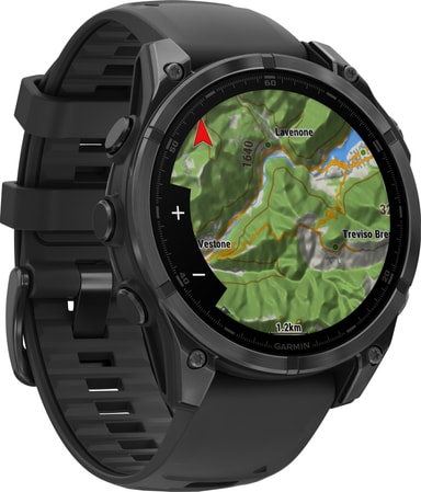 Takket være multi-band GPS med SatIQ-teknologi, inkluderer Fenix 8 også posisjonssporing. Når du starter en GPS-relevant aktivitet, slås sporingen på automatisk, og når du stopper den stopper den, og sparer deg for dyrebar batterilevetid. Bruk GPS for løperuter, virtuelle racingpartnere eller veddeløpsbanens start- og endepunkter. I tillegg kan du dra nytte av innebygde kart for golfbaner og skisteder.