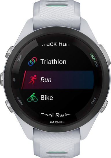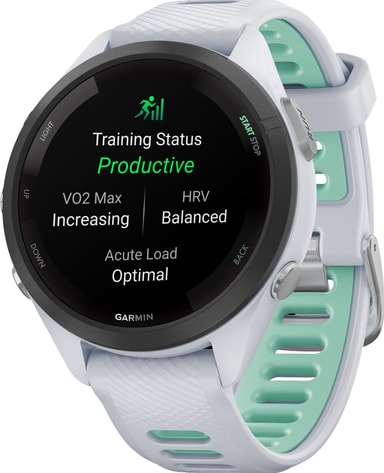 Forerunner 265S er utstyrt med et stort bibliotek med treningsprogrammer og sportsapper, som gir deg en omfattende pakke med treningsfunksjoner. Over 30 aktivitetsprofiler gir deg statusoppdateringer og detaljer mens du trener, direkte på håndleddet. Race Widget hjelper deg med å planlegge løpsstrategien din, og tilbyr tilpassede treningsøkter basert på informasjon fra treningen din. Den gir deg tips og daglige forslag til treningsøkter, og viser forventet sluttid for løpet, vær, kondisjon og mer for å holde deg motivert. Acute Load-funksjonen sammenligner de siste treningsøktene dine og gir deg tips om optimal rekkevidde, mens Garmin Coach fungerer som din personlige trener med tilpassede treningsplaner og personlige treningsøkter. I tillegg gir den håndleddsbaserte løpsdynamikken deg en omfattende løpsrapport med innsikt i løpekraft, bakkekontakttid, steglengde og mer.
