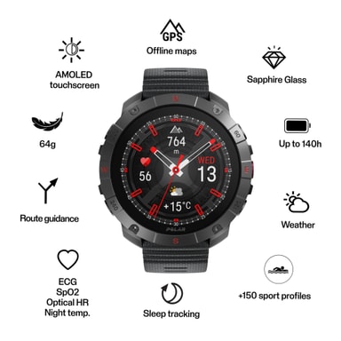 Reis ut på nye eventyr med Polar Grit X2 Pro sportsklokke S-L, designet for å kunne motstå de tøffeste forhold og gir deg en rekke med navigasjons- og ytelsesverktøy. Enten du bestiger fjell eller utforsker urbane landskap, vil Grit X2 Pro være din ultimate ledsager, med en kraftig konstruksjon bestående av en AMOLED-skjerm dekket av safirkrystallglass, huset av rustfritt stål. Klokken har over 150 sportsmoduser, puls- og ECG-overvåkning, samt smarte varsler og musikkontroller. Videre, batteriet gir deg opptil 140 timers brukstid i eco-treningsmodus, og opptil ti dagers bruk i smartklokkemodus. Klokkeremmen passer håndledd med sirkumferens på 135-210.