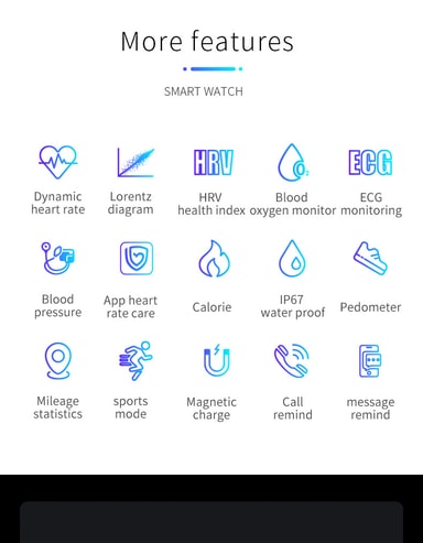 Mange flere funksjoner: Aktivitetssporing med påminnelse om meldinger og telefonsamtaler, push-varsler, avvisning av samtaler, fjernkontroll av mobilkameraet, skritteller, kalorier, avstand, kvinnelig helsesporing, stillesittende advarsel, vibrasjonsalarm, tidtaker og stoppeklokke.