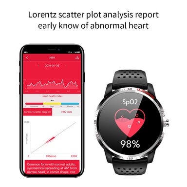 Døgnkontinuerlig helsemonitor for hjertefrekvens og blodtrykk: Bruk klokken din døgnet rundt for å få en HRV-helserapport inkludert Lorentz-Scatter-plotanalyse i appen. Du kan slå på flere helseovervåkingsfunksjoner i appen. Automatiske overvåkings- og helserapporter i appen holder deg oppdatert på statusen din, og du kan også lese statistikken din i sanntid direkte på klokken. Du får dessuten mer detaljerte søvndata som dyp søvn / lett søvn i appen.