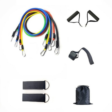 fikasjoner: Materiale: TPR+Nylonmotstand: Gul - 10 kg rød - 15 kg grønn - 20 kg blå - 25 kg svart - 30 lbs Pakken inneholder: 5 x håndtak motstandssnor 2 x 2 x ankelstropp 1 x døranker 1 x oppbevaringspose 1 x engelsk brukerhånd bok